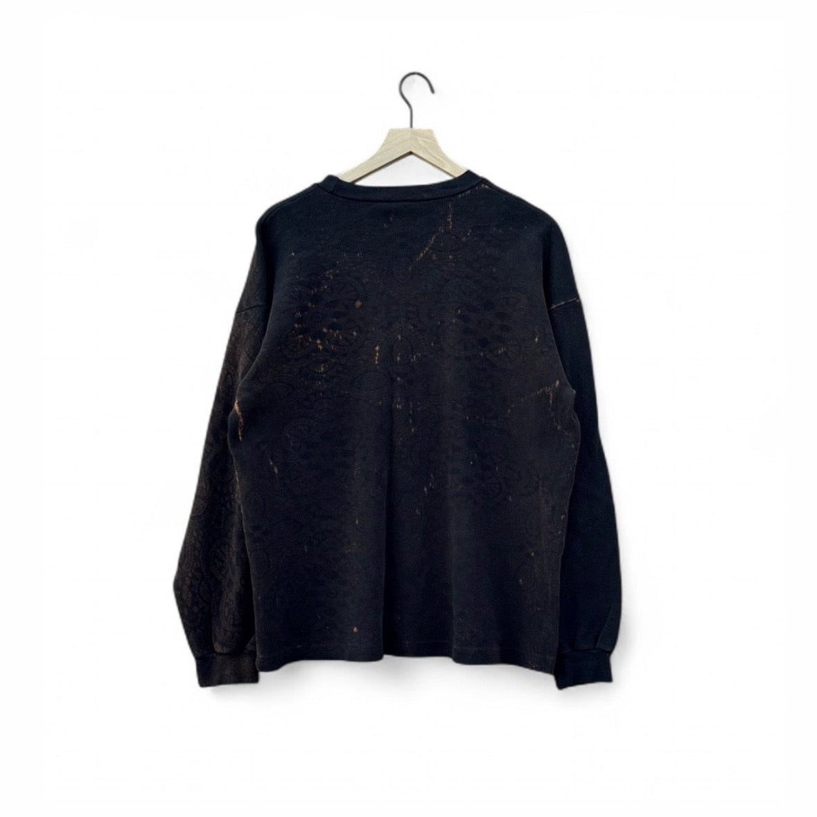 This waffle knit thermal is cut from sustainably sourced cotton and treated by hand with a bleach process, giving the surface an irregular contrast to create a one-of-a-kind lace pattern, so no two pieces are identical.